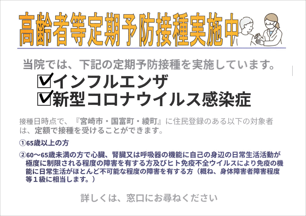 ※1 接種日時点で『宮崎市・国富町・綾町』に住民登録のある方で、65歳以上もしくは60~65歳未満の方で心臓、腎臓または呼吸器の機能に自己の身辺の日常生活活動が極度に制限される程度の障害を有する方及びヒト免疫不全ウイルスにより免疫の機能が日常生活がほとんど不可能な程度の障害を有する方(概ね、身体障害者障害程度等1級に相当します。)が対象となります。